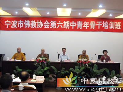 2010年7月26日至29日,浙江省宁波市佛教协会第六期中青年骨干培训班在鄞州区党校举办。市民宗局局长陆立宪,市民宗局副局长徐松庆,市民宗局一处处长章洪春,市佛教协会会长、天童禅寺方丈诚信法师,市佛教协会常务副会长兼秘书长、七塔寺方丈可祥法师,市佛教协会副会长徐文芳,市佛教协会副会长、阿育王寺方丈界源法师等出席培训班。宁波市各县(市)区60多所寺院的出家二众80多位法师参加培训。