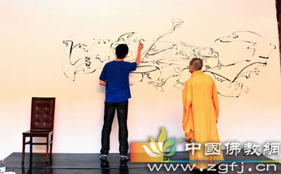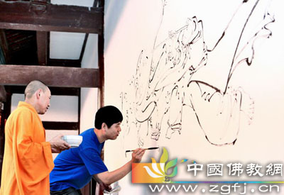 昨(4)日上午,中国观音故里旅游区广德寺里,梵音声声,墨香飘散。著名画家、中国国画院副院长、上海虹桥画院院长唐天源先生专程来到这里,为广德寺挥毫创作大型壁画《广德和谐法禧图》。壁画绘于古寺法堂之后宽10米、高6米的墙壁上,采用中国画传统白描技法创作,主要内容为佛教人物观音、罗汉形象。图为唐天源正在现场创作壁画。