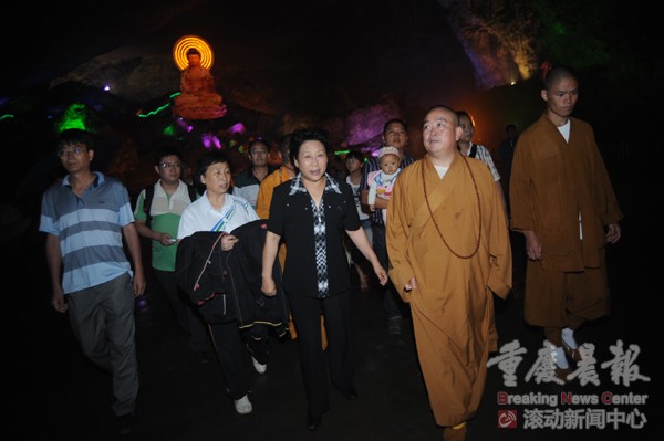 5日下午,在一群身着黄色僧服重庆僧人的陪同下,中国佛教协会副会长、中国当代高僧、少林寺方丈释永信来到金佛山北坡下的礼佛台,参观公里长山顶天然卧佛。