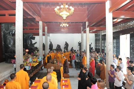 在福严寺方丈楼听大岳法师开示并合影留念后,居室们到大雄宝殿参加了近二个小时的万福大法会。最后,居士们在领取法会纪念品后离去。