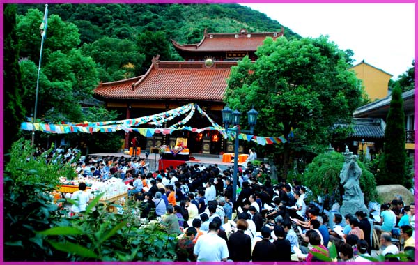 农历七月十四这天,上传下喜恩师率四众弟子恭颂《盂兰盆经》,晚上进行心灵讲座 暨蒙山甘露施食超荐法会。
