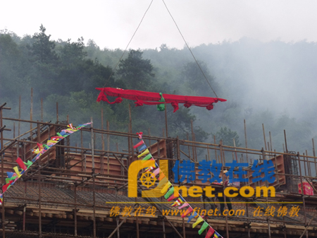 莲华法师说法语:“巍巍宝殿从地起,金梁遮日耸东庐;十方大众成就力,大圆觉智为伽蓝。”随着法师三声响亮的“升”,顿时鞭炮齐鸣,大殿主梁徐徐上升并安装到位,上梁仪式圆满完成。