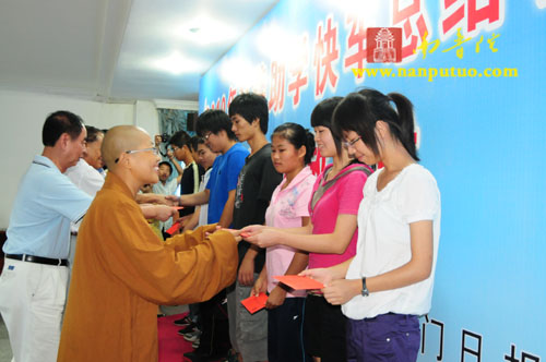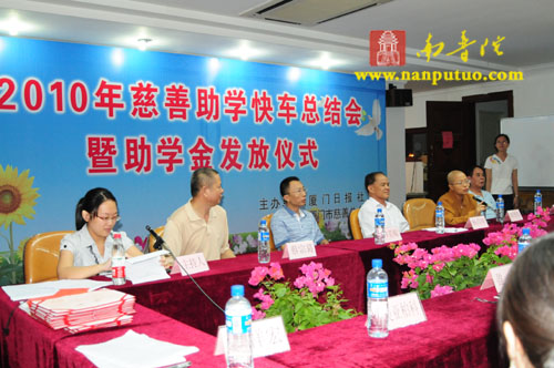 8月31日,受厦门南普陀寺慈善会会长圣辉大和尚嘱托,普陀法师、德鸣法师、静仁法师一行在厦门市民政局四楼会议室,参加厦门市慈善总会与厦门日报社联合举办的“2010年慈善助学快车总结会暨助学金发放仪式。”我会在此次活动中资助15名贫困大学生,每名3000元,发放助学金4.5万元。