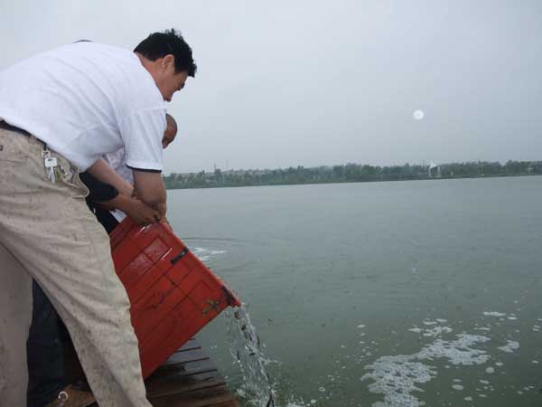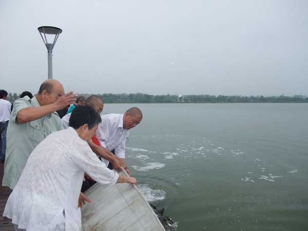 随后,满载长鱼、黑鱼、鲶鱼、泥鳅、甲鱼、蜗牛的三辆货车和三辆乘坐僧众、居士的面包车,驶向徐州新城区大龙湖。来到大龙湖边,大雨继续下着,兴化寺监院常信师率众抬下鱼筐,把鱼、蜗牛倒向湖里。只见放生的鱼儿欢快地游向湖中,有的鱼还把头竖直露出水面,左右晃动,彷佛在向放生的众人吿别。