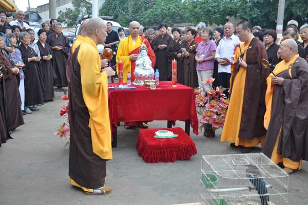 上午8时30分,兴化寺东山门外,供桌上尊放着观音菩萨像,红烛閃閃,香火缭绕。果光大和尚率僧众和数百名居士,虔诚地诵经、叩拜、洒净。在一阵阵欢呼声中,打开鸟笼,三百多只大中斑鸠、喜鹊、麻雀,争先恐后地飞向天空,飞向树林,飞向云龙山。