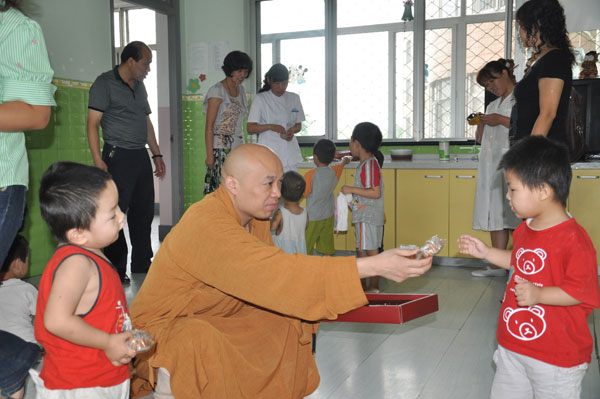 2010年9月16日,艳阳高照,天气格外晴朗。这天上午九点,江苏省佛教协会副会长、徐州佛教协会会长、徐州兴化寺方丈果光大和尚,兴化寺监院常信法师,兴化寺知客源仁法师以及兴化寺功德会工作人员带着五千多元的中秋月饼、各种食品,到位于徐州南郊的徐州社会福利院慰问这里的儿童。这些月饼、食品是果光大和尚在9月15日专门安排兴化寺功德会工作人员从大超市买来的,赶在今年中秋节前送给这里的儿童。
