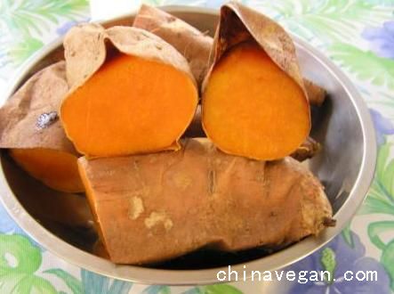 6.将红薯(以红皮黄心者为最好)洗净,连皮切成小块,加水与米同煮稀粥