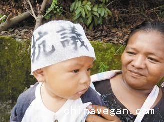 近500多名箕湖村民头绑白布条、手举抗议牌子,抗议大成长城事前未与居民沟通就兴建养猪场,污染水源及环境,影响生活质量。