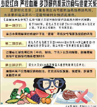 新饮食指南告诫国民,减少食用肉排汉堡包、香肠及其他红肉,将有助于防止癌症。政府专家告诫人们,一个星期的红肉食量以500克为限,也即一天红肉的食量限于70克。这比1998年政府饮食指南中建议的每天限量90克减少了。