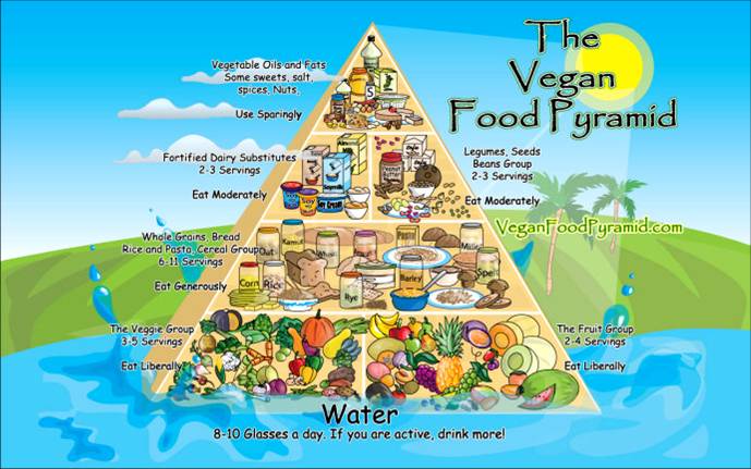 上图中的“素食金字塔”于1997年面世,是由康乃尔大学和哈佛大学的营养医学专家合作开发出来的一套健康的饮食方案,用于代替过时的有肉蛋奶的饮食金字塔。 在该四级金字塔中,最底层为水果、蔬菜5-9份,第二层为全谷物淀粉类食物(燕麦、粗麦包、大麦、大米、面粉及玉米等)6-11份;第三层为干果、种子、豆类等植物蛋白制品4-6份;顶层为植物油、调味料、甜品和(油性)干果少量。