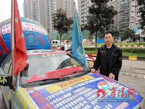 这是一辆破旧的轿车,车尾装了个硕大的地球仪,车前插着两个旗帜,在车头的防护镜上写着“低碳四川资阳站”,“地球”和车身上写满了低碳环保的宣传口号,旁边站着一位中等身材的黑脸汉子,他就是这辆车的主人——蒋桂山。