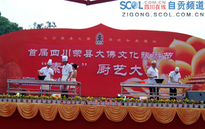首届大佛文化旅游节进入到第3天,来自全县20多个单位参加了本次素食厨艺大赛,高峰宾馆以9.46分获得全场最高分,荣县县政协主席王斌儒,县人大常委会副主任周本光,副县长陈明、郭连,县政协副主席吴平观看了比赛并为获奖单位颁奖。