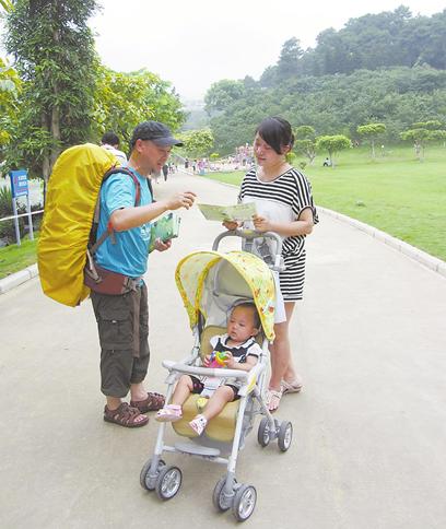 6月22日,南宁石门森林公园内,记者偶遇他。他正背着重重的行囊徒步行走,一边还把手中一沓宣传单分派给公园里的游客。他的行囊上印着“素食环保行走中国”———这也是他分派宣传单的目的。
