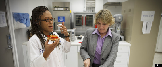 2012年7月3日在德克萨斯州的休斯顿,美国宇航局高级食品技术项目经理米歇尔·潘乔努克 (上图中右)(Michele Perchonok)和洛克特·马丁研究科学家玛雅·库珀,正在约翰逊空间中心的厨房中试尝一个比萨食谱。NASA现在正在规划一个火星使命,在那里有重力,所以准备食物可以有更多的选择,例如切碎的蔬菜,这与目前太空任务仅有脱水食物不同。