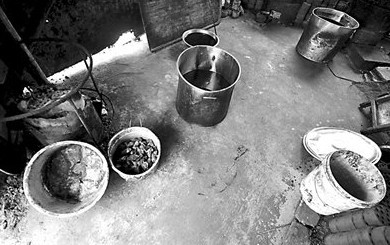 在“村”里一座二层私宅背后,有个破破烂烂的简易棚。棚内污物、杂物遍地,四处飘荡着腥臭味,成群的苍蝇嗡嗡乱飞。作坊里有两口大黑铁锅,几个黑乎乎的大桶,桶里还装着4月27日执法人员突击检查前尚未来得及出售的“猪油”。