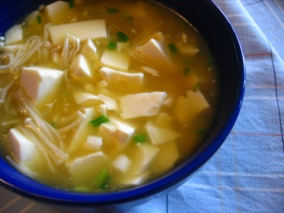 日本料理中极富特色的“汤豆腐”的制作方法并不复杂:人们将做好的豆腐切成一小块一小块后放进小锅,边煮边吃;吃的时候,只需蘸简单的调味料,如酱油葱花或捣成泥状的生姜即可。