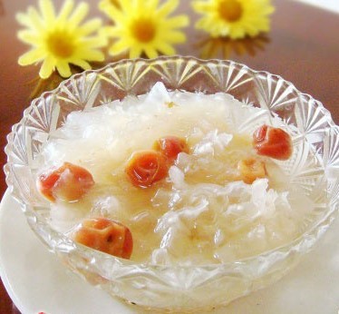 银耳50克、樱桃30克、桂花和冰糖适量。先将冰糖溶化,加入银耳煮十分钟左右,再加入樱桃、桂花煮沸后,随意食之,此羹有补气、养血、白嫩皮肤、美容养颜之功效。