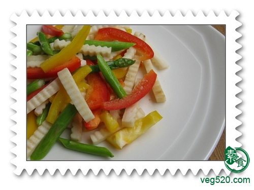 食材:椰子芯,芦笋,彩椒,蒜末,盐